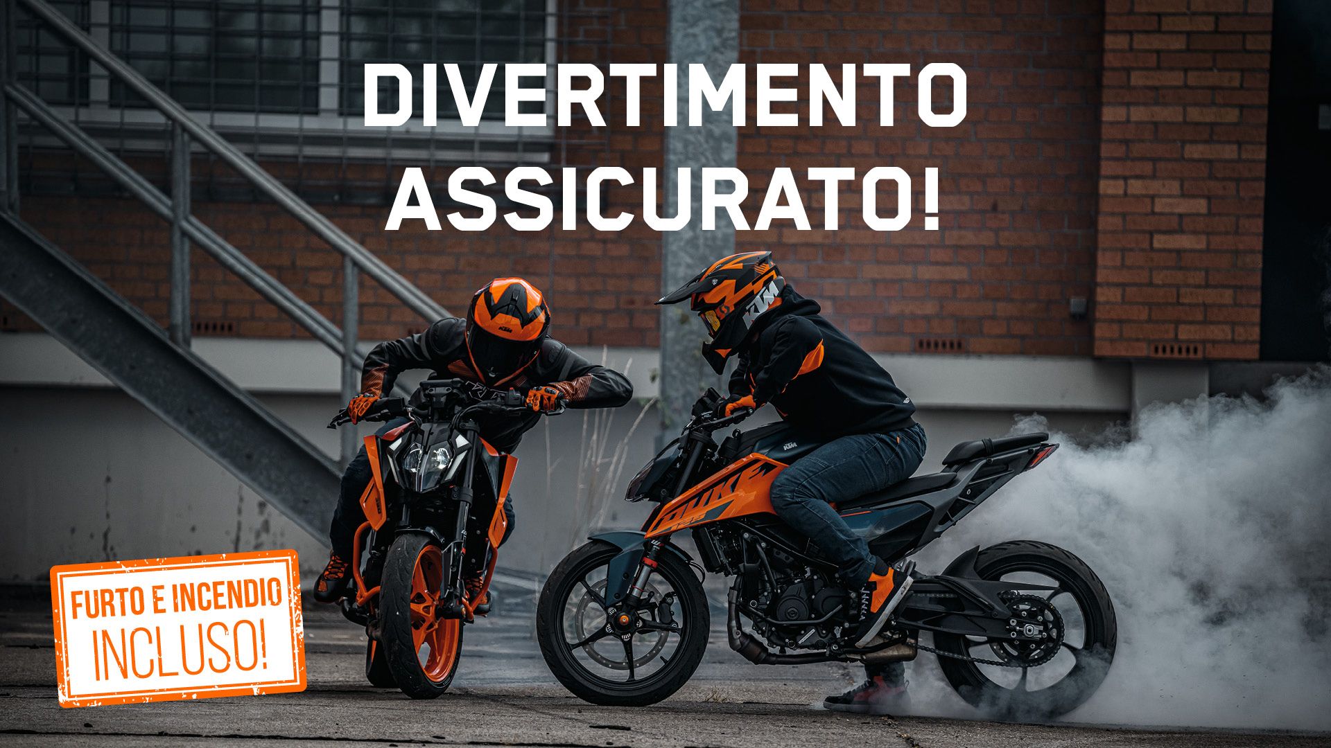 Fino al 31 ottobre, con la formula DIVERTIMENTO ASSICURATO, a fronte dell’acquisto di un modello 125/390 DUKE, RC 125/390 o 390 ADVENTURE con un finanziamento KTM Finance, i Concessionari Ufficiali KTM offrono inclusi nel prezzo 12 mesi di copertura Furto & Incendio firmata UnipolSai per una durata di 12 mesi e il sistema di identificazione ottica basato sulla tecnologia QR CODE di I.Car.